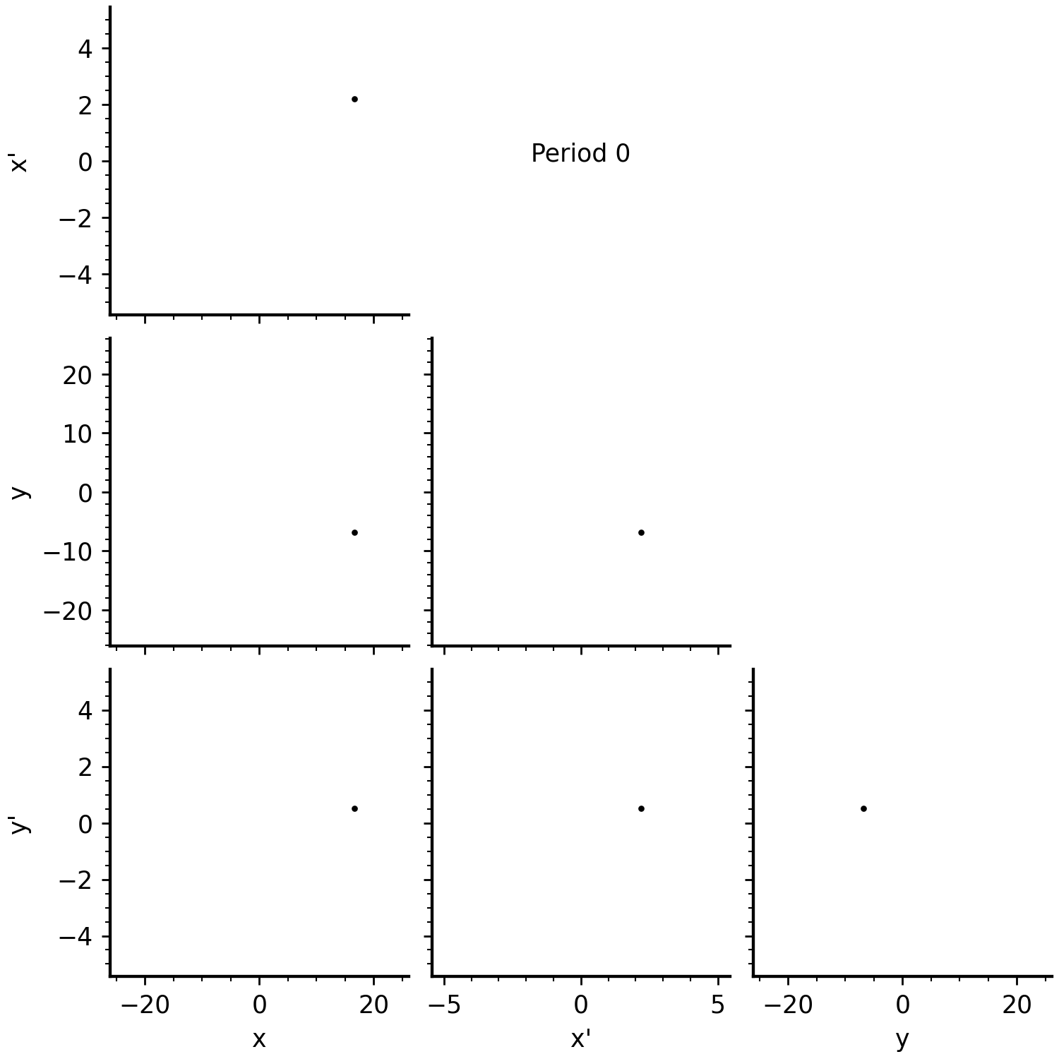 This is an elegant parameterization of the dynamics. Can we do something similar for coupled motion? To start, let’s track a particle in a lattice with a nonzero skew quadrupole coefficient and plot its phase space coordinates after each turn.