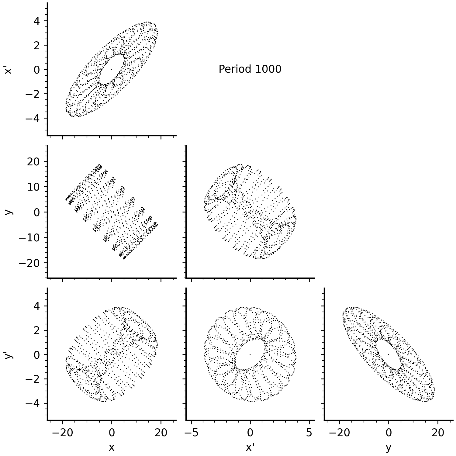 Figure 3 shows the 2D projections of the turn-by-turn coordinates. Instead of ellipses, the particle traces donut-like shapes in the \(x\)-\(x'\) and \(y\)-\(y'\) planes. Figure 4 shows the result after 1000 turns.