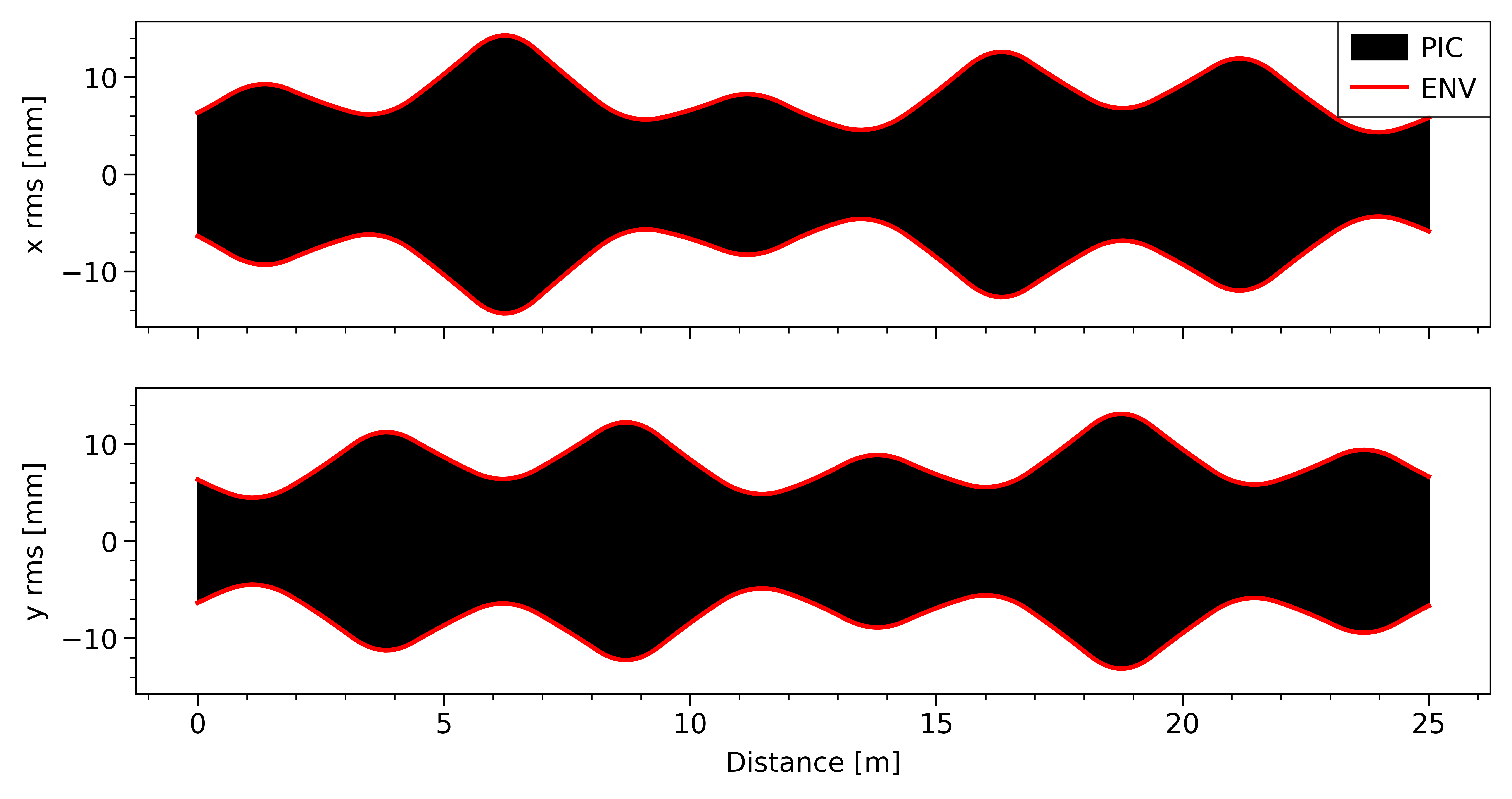 We’ll track the bunch through five lattice periods and record the rms beam size as a function of distance, comparing the envelope solver predictions to PIC predictions. Since the space charge forces are completely transverse, we’ll use a 2D space charge solver.