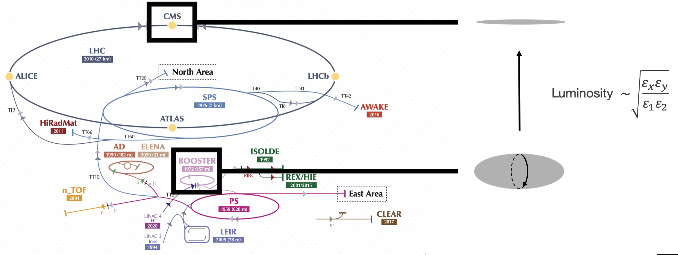 Vortex distributions could be used to increase luminosity in high-energy colliders [5]. To maximize the luminosity (the number of collisions per unit time per unit area), we want to maximize the particle density at the collision point. Unfortunately, the density is fundamentally limited by space charge forces during the low-energy stages of acceleration. But we can play a trick: we can accumulate a round vortex beam, accelerate it to high energy, and then remove its angular momentum using a series of skew quadrupoles. The skew quadrupoles simply map the projected emittances \(\varepsilon_{x, y}\) to the intrinsic emittances \(\varepsilon_{1, 2}\). If the initial beam has a large intrinsic emittance ratio, the final beam will have a large projected emittance ratio. This is the so-called round-to-flat (RTF) transformation [6] shown in Figure 7. Since inter-particle forces are negligible at higher energies, this scheme essentially bypasses the space charge limit on the beam density.