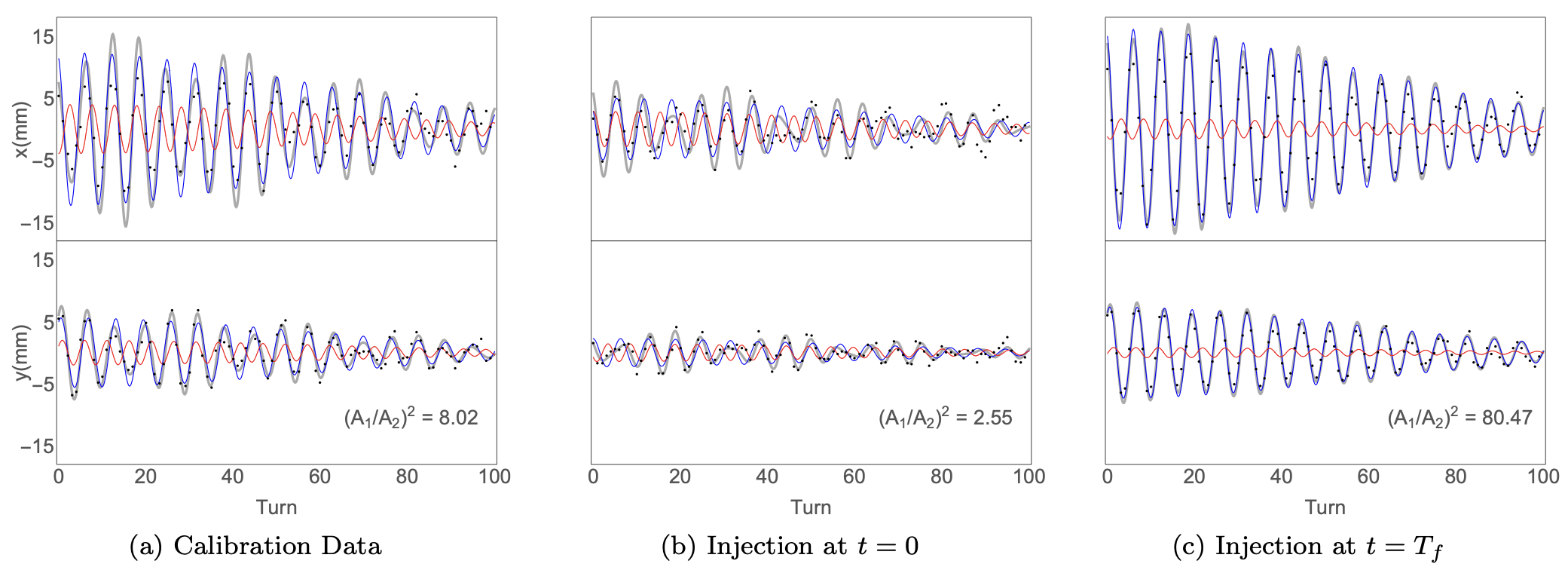 Figure 12 shows data from one of the many BPMs in the ring. In each figure, the grey curve shows the linear model fit, the blue curve shows the mode-1 component, and the red curve shows the mode-2 component. The left figure shows an initial machine state used for calibration. Notice that both modes contribute to the signal. The middle column shows the start of injection (\(t = 0\)), when the amplitudes should be as small as possible. We did not actually reach zero amplitude, but the amplitudes are smaller than in the other figures; we want to correct this in future experiments. The right figure shows the end of injection (\(t = 1\)). Notice that the first mode frequency dominates over the second, as expected for particles injected along an eigenvector.