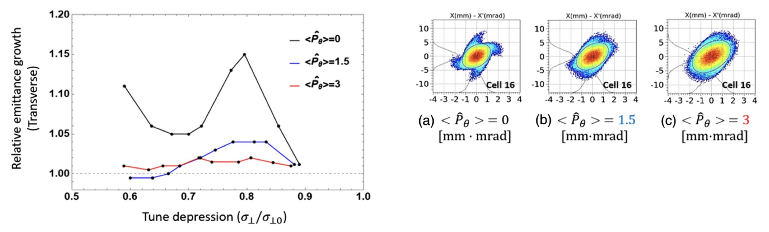 Vortex distributions could also mitigate space charge effects. Consider a simplified model that represents the beam as a frozen background potential \(\phi(x, y)\). In a Gaussian distribution, the potential contains terms proportional to \(x^2\), \(x^4\), and so on. These terms act as periodic nonlinear driving forces, leading to resonance at certain frequencies. These resonances are sometimes called space charge structure resonances. The classic example is the fourth-order resonance, which creates four islands in \(x\)-\(x'\) phase space. Recently, Cheon et al. [7] showed that angular momentum can suppress the fourth-order resonance in linear accelerators (Figure 9), and I expect the same could hold in circular accelerators. A pure vortex beam with \(\varepsilon_2 = 0\) is an extreme case of zero relative motion of particles in the beam.
