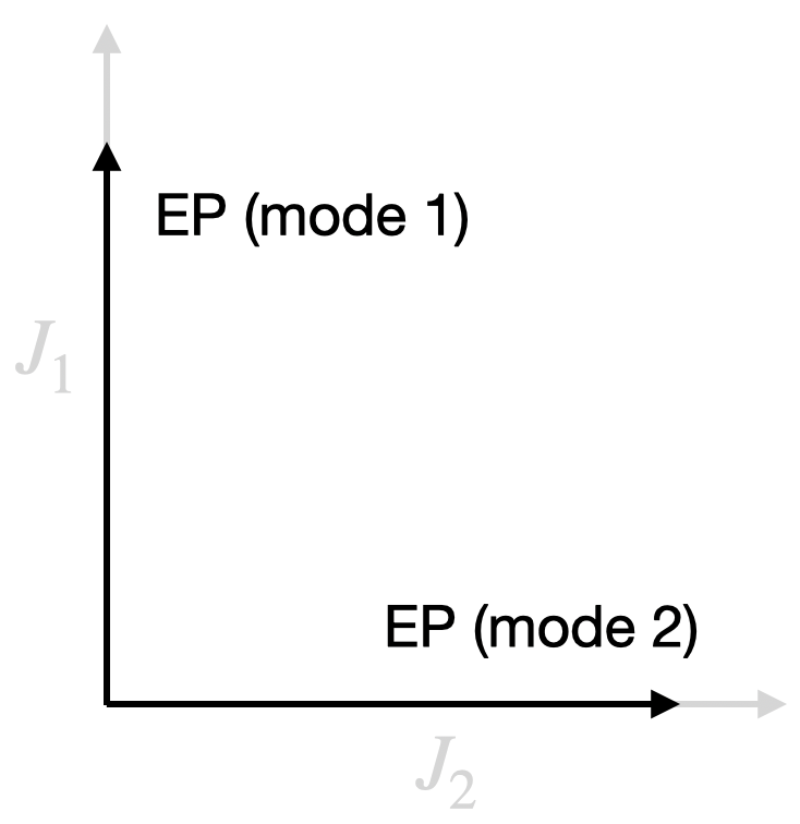 where \(t\) is the time, scaled to the range [0, 1], and \(\tilde{J}_1\) is a maximum value of \(J_1\). We could also paint into the other mode by swapping \(J_1\) and \(J_2\). We can represent the painting path as a curve in the \(J_1\)-\(J_2\) space: