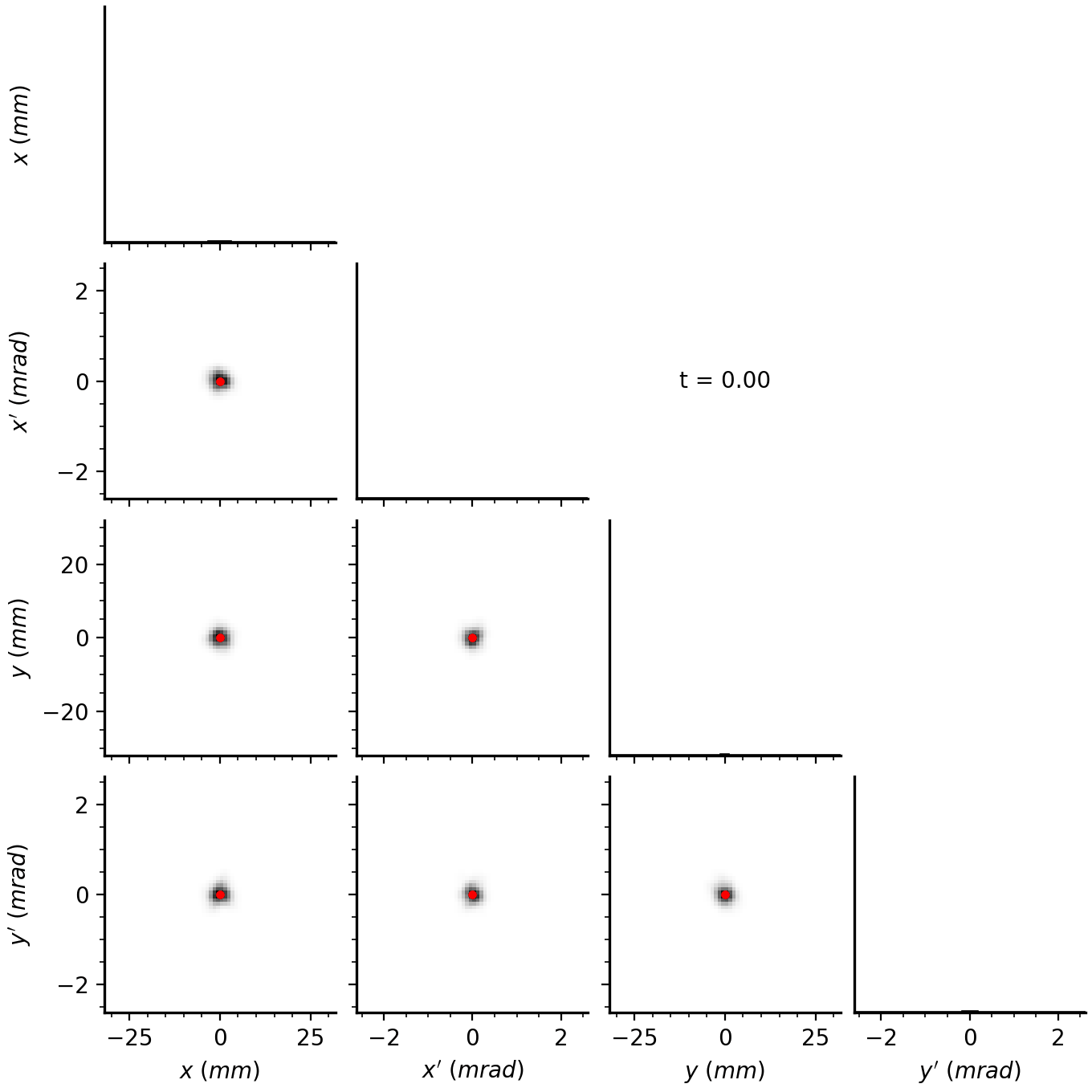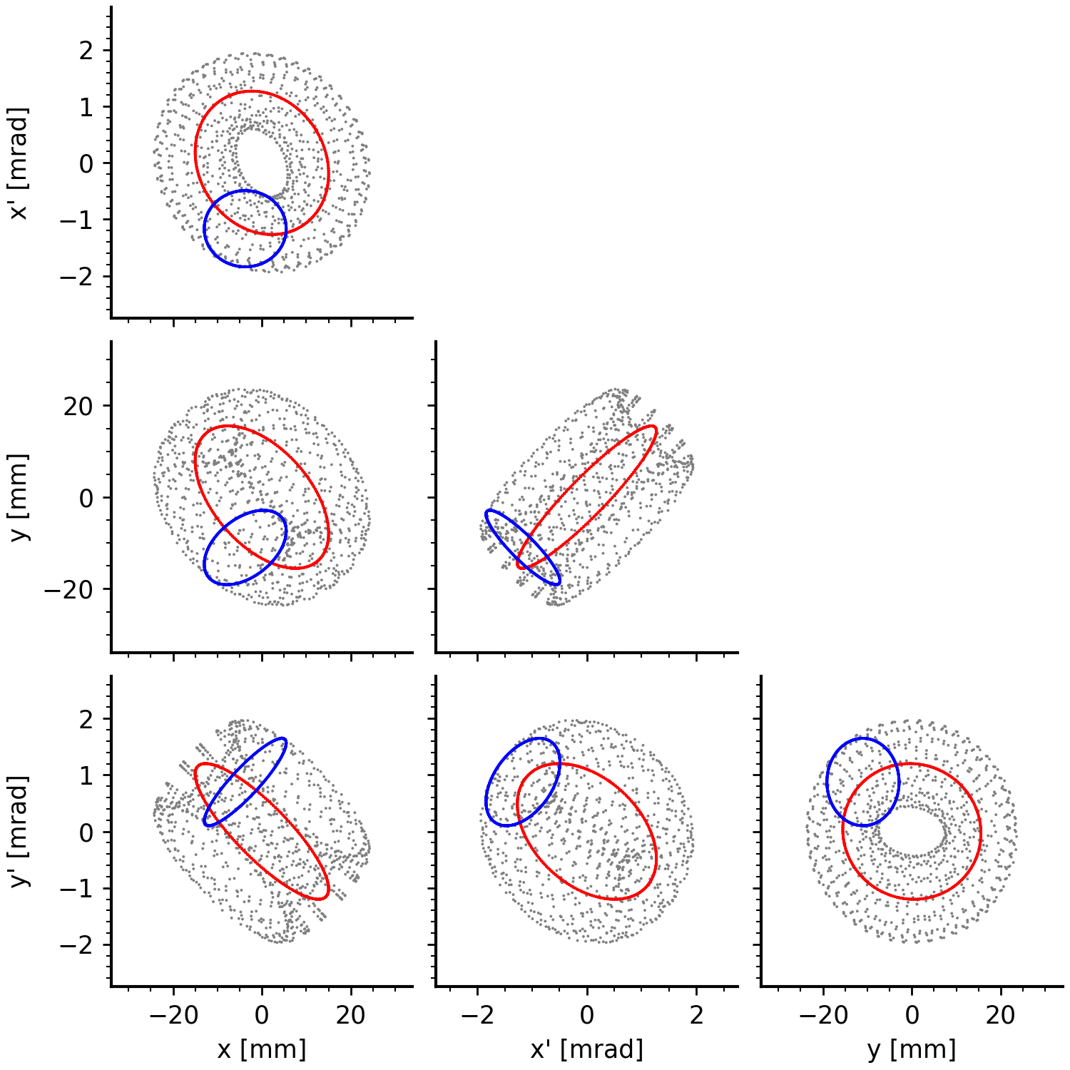 where \(x\)-\(y\) are the transverse positions, \(x'\)-\(y'\) are the velocities, and \(\langle \dots \rangle\) is an average over all particles. The covariance matrix defines an ellipsoid from the expression \(\mathbf{x}^T \mathbf{\Sigma}^{-1} \mathbf{x} = 1\). The four-dimensional emittance \(\varepsilon_{4D}\) is the volume of this ellipsoid: