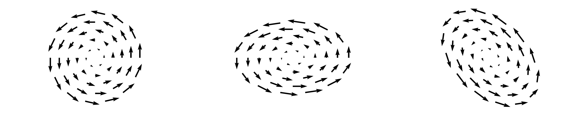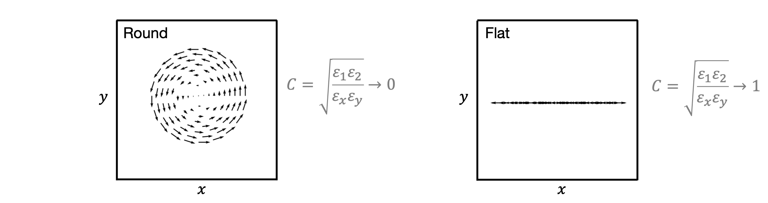 The eigenpainted beam has a very large ratio of intrinsic emittances: \(\varepsilon_1 \gg \varepsilon_2\); therefore, the particle motion is dominated by a single elliptical mode. I’ll call this a vortex distribution referring to the spiral pattern of the velocity field.3 Note that a vortex distribution can have any distribution in the \(x\)-\(y\) plane; the important part is the velocity.