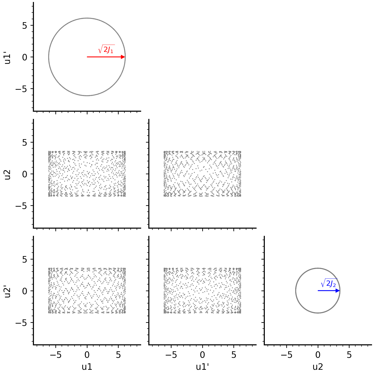 In the “normalized” coordinates \(\mathbf{u} = \mathbf{V}^{-1} \mathbf{x}\), the particle simply rotates in each phase plane, tracing circles of area \(2 J_k\) at frequencies \(\mu_k\). The cross-plane projections are rectangular because there is no coupling in the normalized frame.