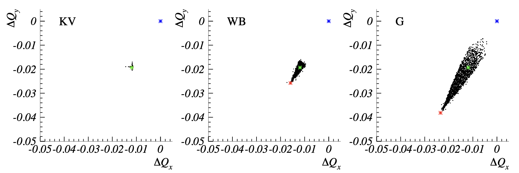 The smallest possible tune spread is obtained in a uniform density bunch in which all particles oscillate at the same frequency (left side of Figure 10). The KV distribution is the only arrangement of particles that gives the desired density. It turns out to be impossible to paint a KV distribution with finite emittance in both planes. However, we can paint a KV distribution with zero emittance in one of the planes [4]. This is just what eigenpainting gives us in Figure 5. Note that the zero-emittance plane is not \(x\) or \(y\).