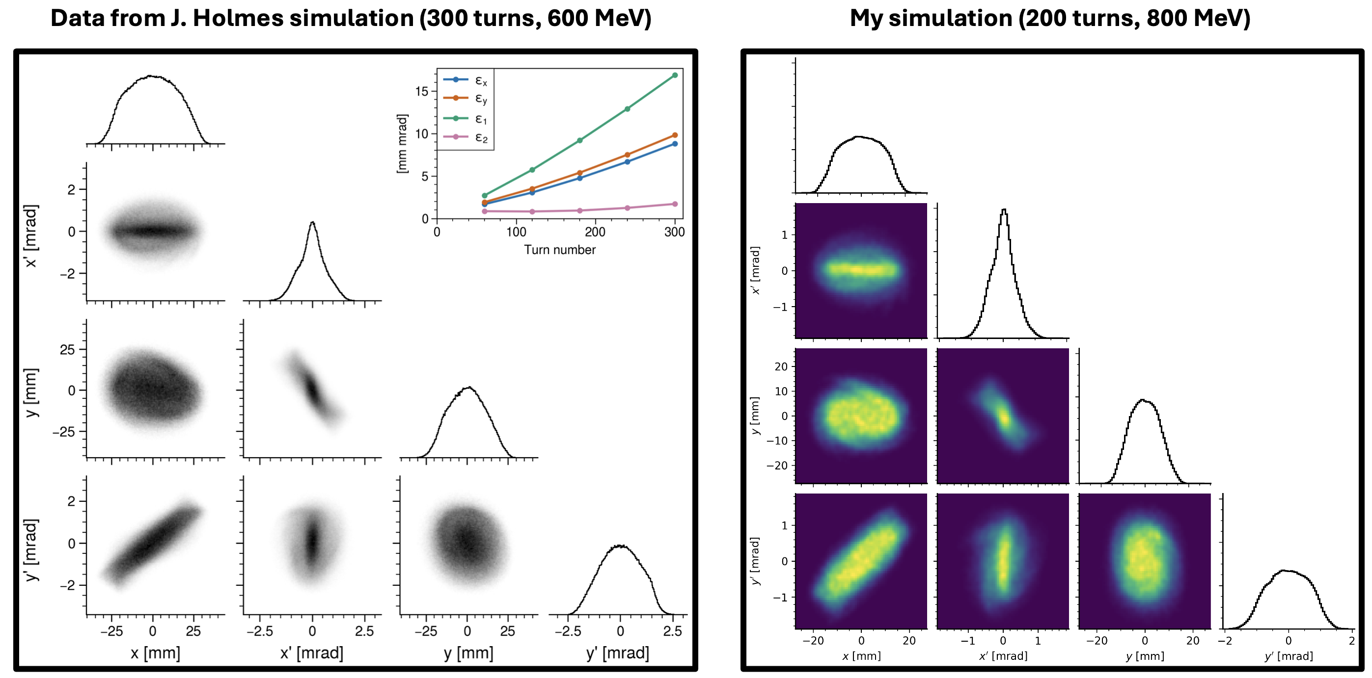 I also compared my simulation to the simulation reported here, which used a lower beam energy, different intensity, and larger painting amplitude. Figure 5 looks pretty close to me. It looks like Jeff happened to land near the modified eigenvector without trying to.