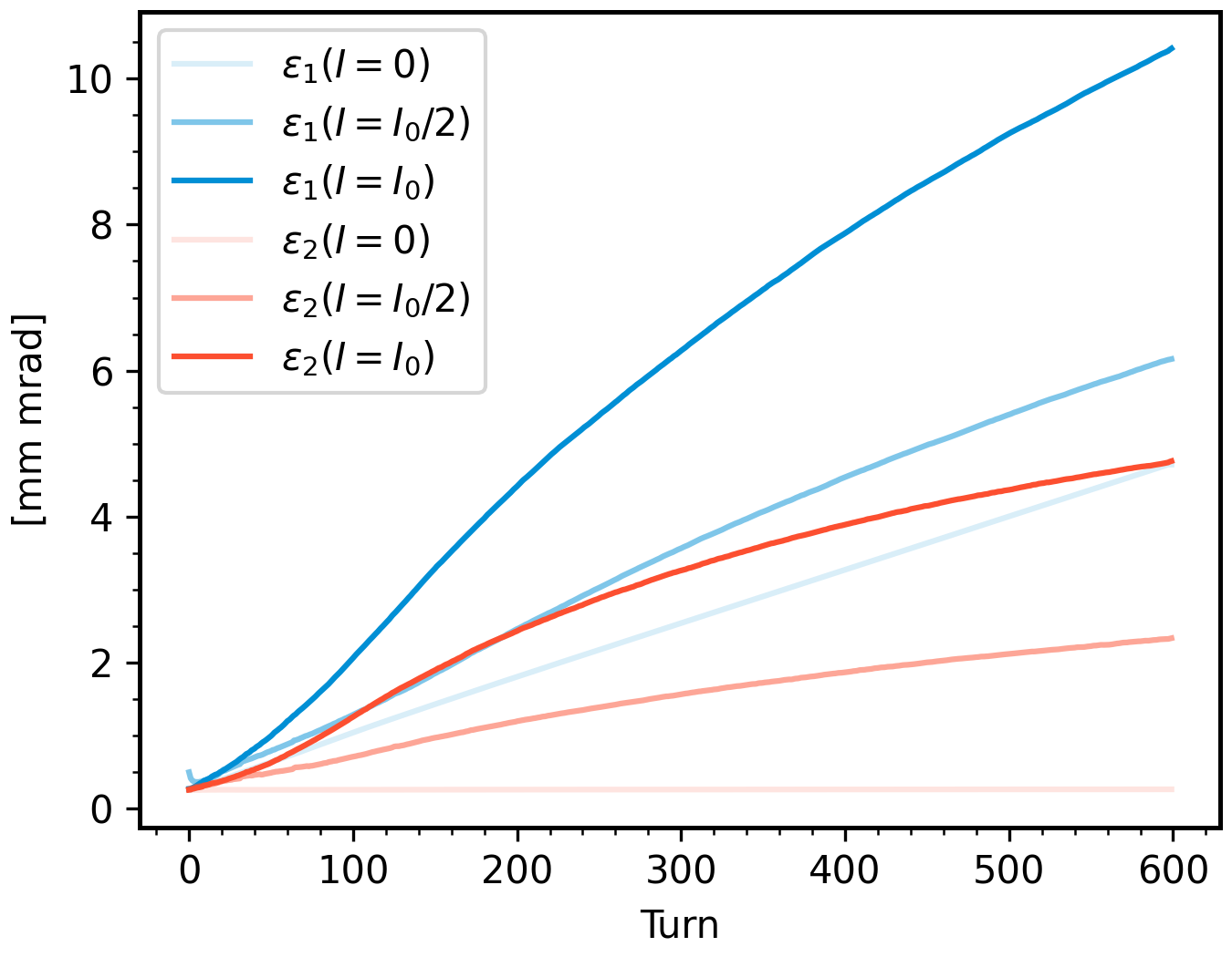 The simulation without space charge predicts \(\varepsilon_1 = 4.2\) and \(\varepsilon_2 = 0.25\), or a ratio of 16. This means there was a large growth of the four-dimensional emittance \(\varepsilon_{4D} = \varepsilon_1 \varepsilon_2\) in our experiment.