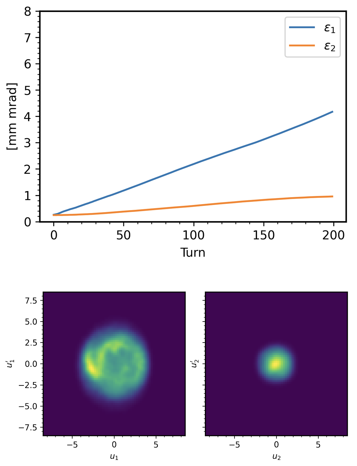 The final emittance ratio is \(\varepsilon_1 / \varepsilon_2 \approx 4\) using the lattice eigenvector and \(\varepsilon_1 / \varepsilon_2 \approx 12\) using the modified eigenvector. Figure 4 (b) shows a beautiful, nearly uniform density in the first mode. I’ll need to rerun these simulations with a more realistic space charge solver and other effects included for a better estimate, but these are great results!